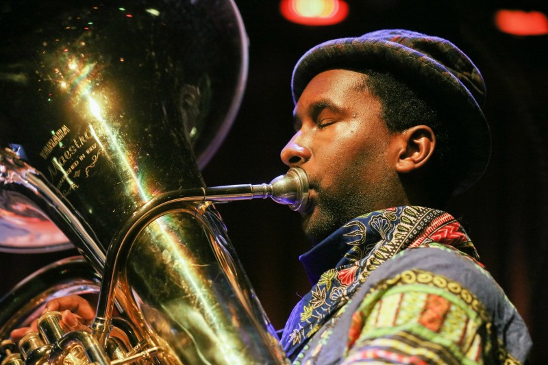 Bij een groep die bestaat uit twee drummers, een tubaspeler en een saxofonist is sprake van een uniek concept. Het solide fundament dat de beide drummers neerleggen is niet alleen origineel; de krachtige synchroon pulserende Afrikaanse grooves en het niet zelden extatische percussiewerk doen de zaal zinderen. De afwisselend swingende, onheilspellende, agressieve en soms zelfs ongemakkelijke dynamiek zorgt voor een aanvallend ritmische modus. De rol van Theon Cross op tuba is al even vermeldenswaardig. De door hem aangelegde baslijnen zijn ronduit funky. Ook verlevendigt hij ogenschijnlijk met speels gemak het groepsgeluid met heroïsch gespeelde solo's. Met grommend, brullend en gillend geproduceerde oergeluiden baant hij voor zichzelf, en zijn kolossale instrument van messing, een weg door de mysterieuze duisternis. De avontuurlijke verbinding van ritme en melodie zorgt voor een kokend en dampend eclecticisme. In deze overdonderende muzikale smeltkroes komen wilde Caribische varianten zoals calypso en ska samen met ethno jazz uit Afrika en zware free-jazz flarden en marsmuziek uit New Orleans. Deze intercontinentale en doordenderende muzikale trein stopt slechts één keer voor een verplichte pauze.